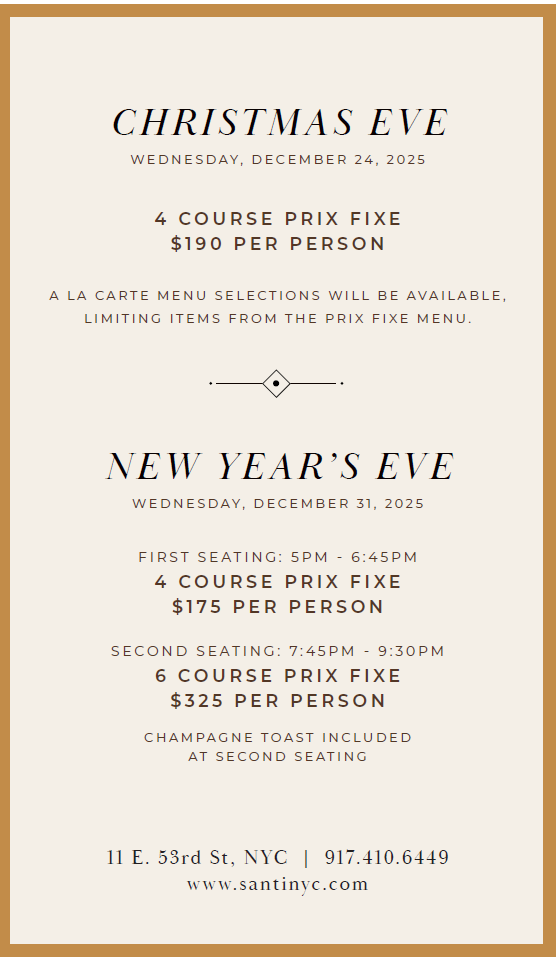 World-renowned and Michelin-starred Chef Michael White returns to NYC with Santi, his stylish new Italian restaurant on Madison Ave. The pan-Italian menu draws from Chef White’s travels and apprenticeships and years living and working in Imola, the Amalfi coast, and the South of France. His culinary journey culminates in Midtown East at Santi with a commitment to simple yet inspired, beautifully crafted cuisine.